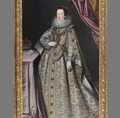 L’opera esposta ritrae Eleonora Gonzaga, figlia minore del duca Vincenzo e di Eleonora de’ Medici, cresciuta nel convento delle orsoline dalla zia Margherita fino al matrimonio con l’imperatore Ferdinando d’Asburgo nel 1622. Un ritratto importante, eseguito in occasione delle nozze della giovane, che la ritrae in vesti maestose, consone al ruolo che andava a rivestire alla corte di Vienna. Eleonora indossa un abito sontuoso di broccato intessuto di fili d’oro e ornato da pizzi, abilmente realizzato dall’artista. Sulla sinistra del corsetto appare un pendente con il monogramma asburgico mentre sul tavolo la corona imperiale e una lettera su cui si legge “alla Sacra Maestà dell’Imperatrice Gonzaga”.